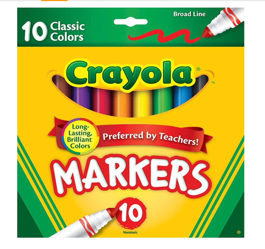 Classic pack of Crayola Broad Line Markers! Conveniently packaged in a reusable tuck box, each set contains 10 Classic Crayola Colors. With its conical tip, the Crayola Broad Line Marker is a versatile drawing tool. Perfect for coloring in large areas, these markers are also great for drawing thin lines or dots. Kids can even create a ribbon effect with lines that taper from thick to thin. Broad line markers lay down plenty of color and won't smudge or bleed through paper. Great for classrooms, art studios, and more! Safe and nontoxic, ages 3 and up.