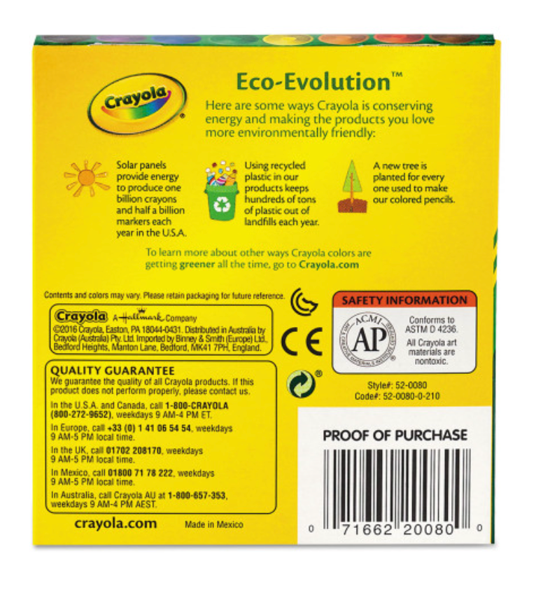 Kids love Crayola Crayons and parents love the hours of creative fun they provide. This crayon set of large crayons in classic colors keeps budding artists entertained for hours. The larger size is designed to make these crayons more comfortable for young artists developing their grip. The many color choices make this set perfect for coloring books and kids crafts. Great for the classroom and at home crafts, this set would make a wonderful gift to students and teachers. Tuck Box. Color(s): Assorted; Color Family: Multicolor; Color Assortment: Black; Blue; Brown; Green; Orange; Red; Violet; Yellow; Crayon Size: 4" x 0.44".