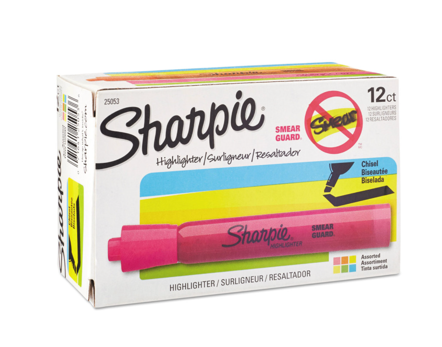 Quick-drying, odorless SMEAR GUARD ink resists smearing. (Based on consumer surveys. Let ink dry before highlighting.) Easy-glide micro chisel tip for smooth and accurate highlighting on both wide and narrow lines of text. Dependable, long-lasting highlighter is ideal for inkjet printouts, written notes, textbooks, newspapers and more. Color won't fade type or bleed through most paper. Open Stock Box. Highlighter Style: Round Tank; Highlighter Ink Color: Assorted; Color Family: Multicolor; Highlighter Ink Color Assortment: (3) Fluorescent Pink; (3) Fluorescent Yellow; (2) Turquoise Blue; (2) Fluorescent Green; (2) Fluorescent Orange.